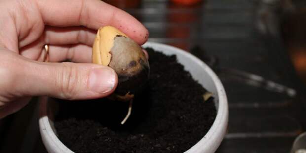 - разместите косточку в центре, оставив её верхнюю часть над поверхностью почвы;